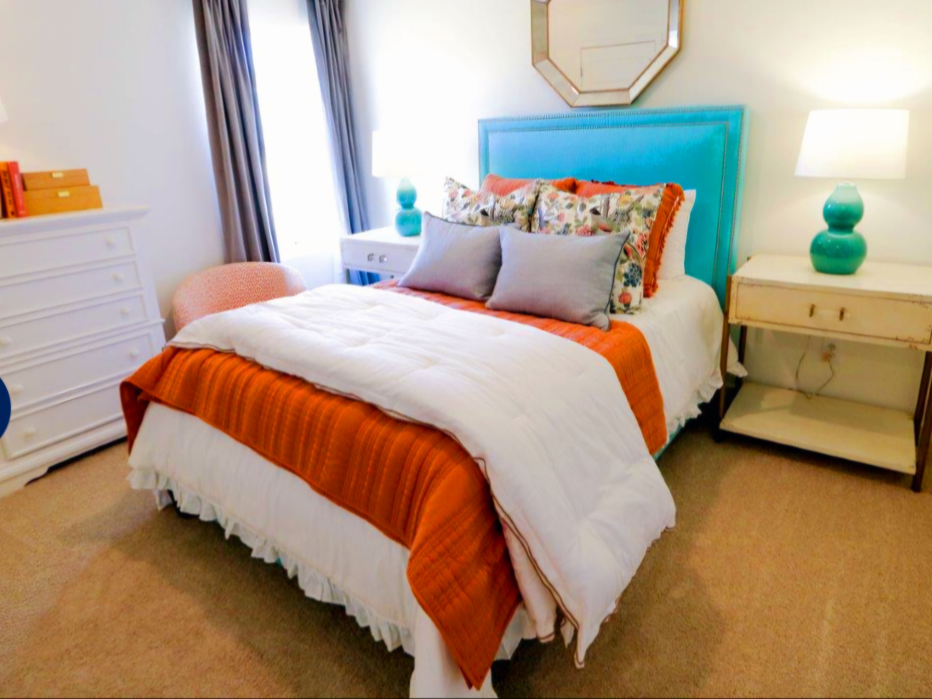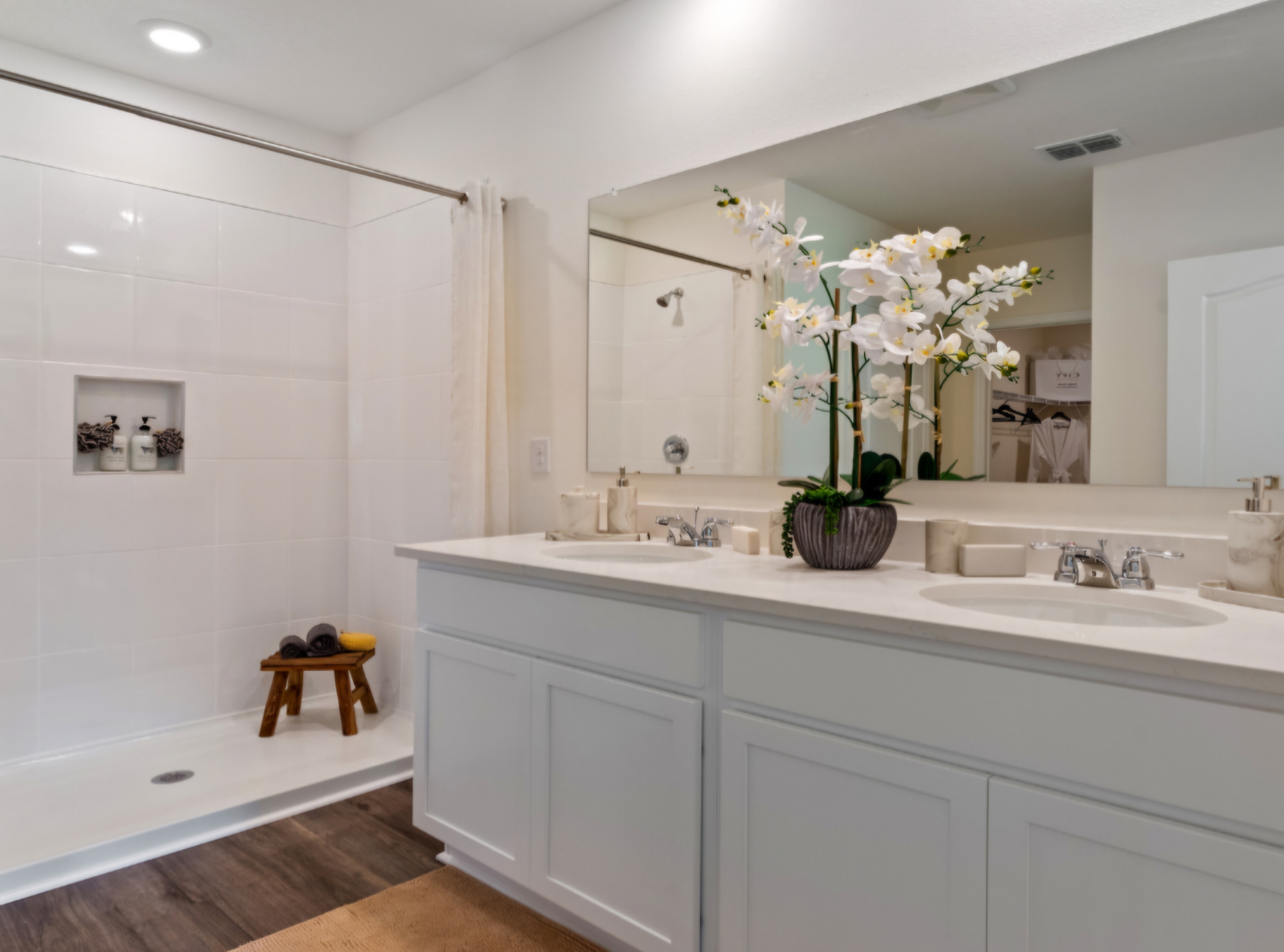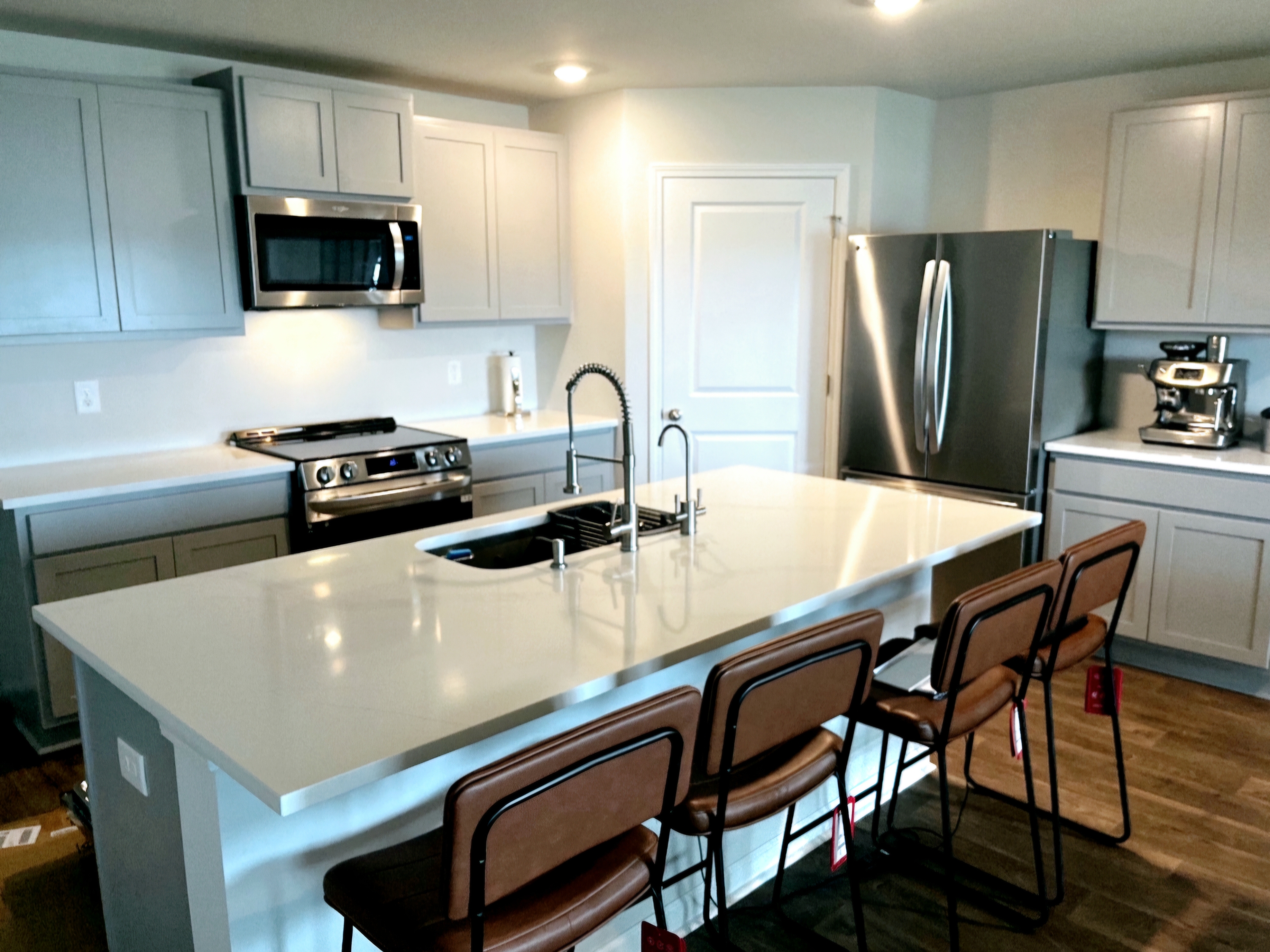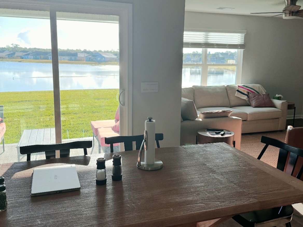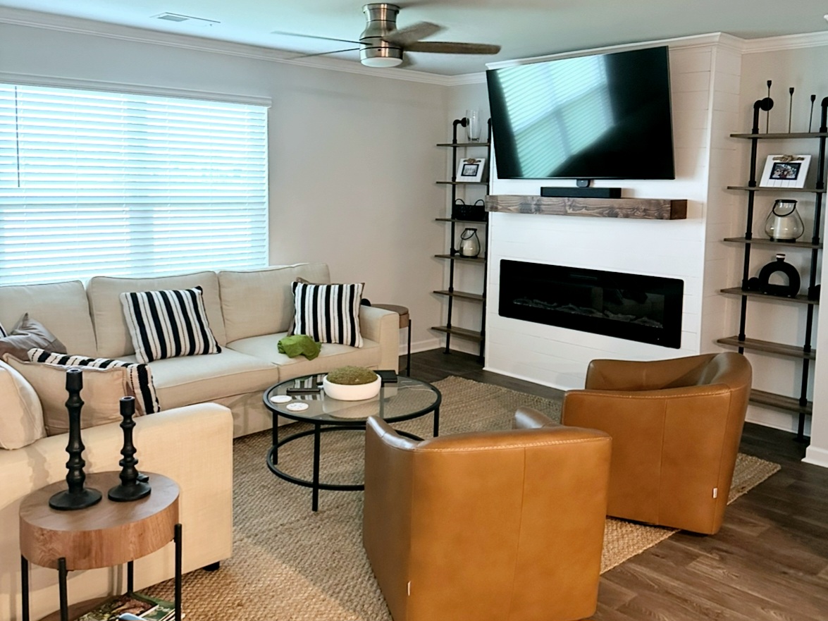 This better than new 4-bedroom, 2-bathroom home on the lake in the coveted neighborhood of Waterside is now available for lease. Upon entering the home you'll discover two front guest bedrooms with a shared bathroom in between. A bit further down the hallway is the 3rd guest bedroom. The open concept kitchen, dining and living area are perfect for family gatherings or entertaining guests. The kitchen is equipped with stainless steel appliances, including a smooth top range, microwave, and dishwasher. The living room features an electric fireplace. The primary suite, located at the back of the house, features an ensuite bathroom with a walk-in shower, walk-in closet, and vanity.